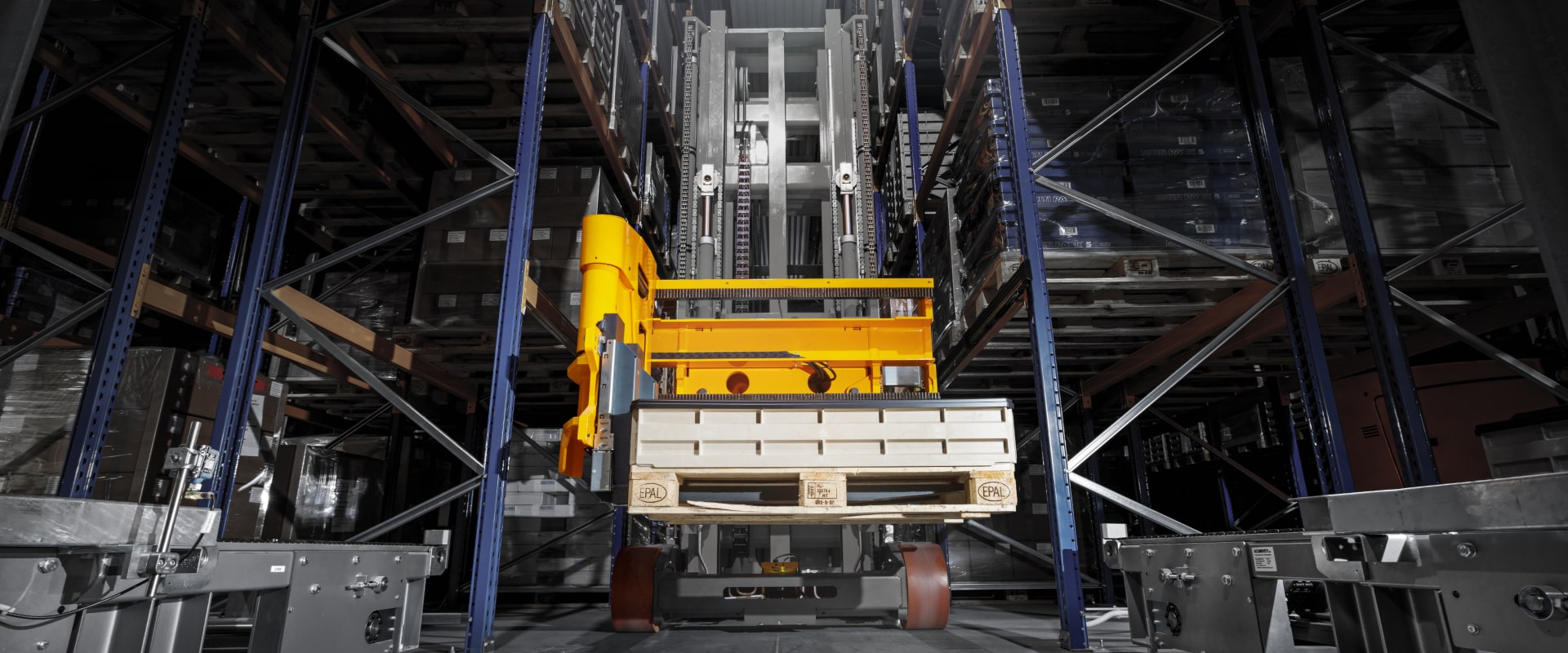 De automatische opslag van ESM Ertl Systemlogistik is gebaseerd op een ‘gewoon’ smalle gangen magazijn. De stellingen (13,5 meter hoog, 14 gangen) bieden plaats aan 13.000 pallets. Zeven gerobotiseerde smalle gangentrucks met telescoopvorken verzorgen de in- en uitslag. Het vervoer van de goederenontvangst naar het opslagsysteem vindt plaats met manuele reachtrucks.