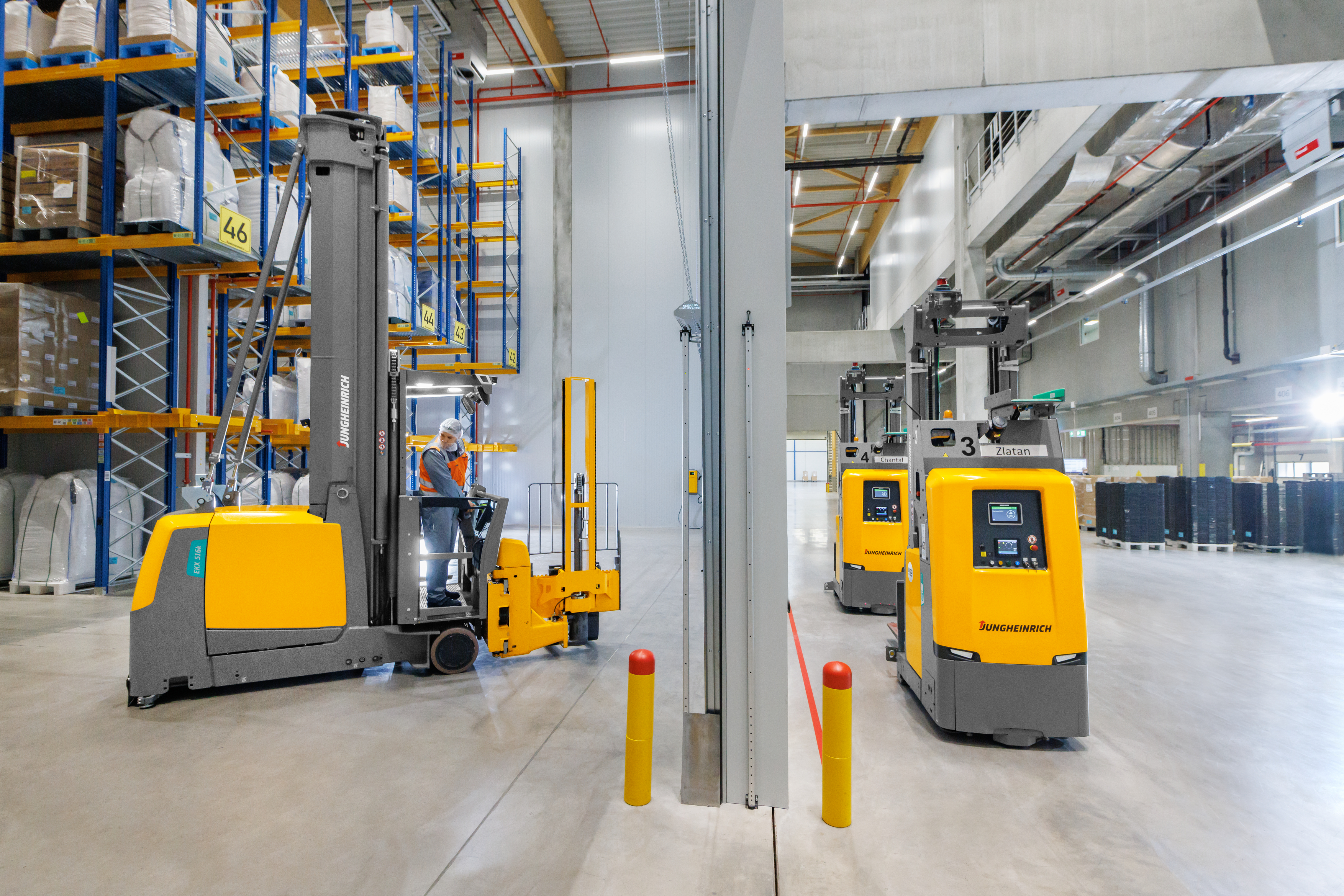 De AGV-vloot wordt aangevuld met manuele EKX 516k en EFX 413 smallegangentrucks. Samen vormen ze een doorlopende materiaalstroom, aangestuurd door de Jungheinrich Logistics Interface. Dit systeem regelt de gemengde operatie van mens en machine, coördineert gangpadwisselingen en voorkomt botsingen via een intelligent verkeerslichtsysteem.