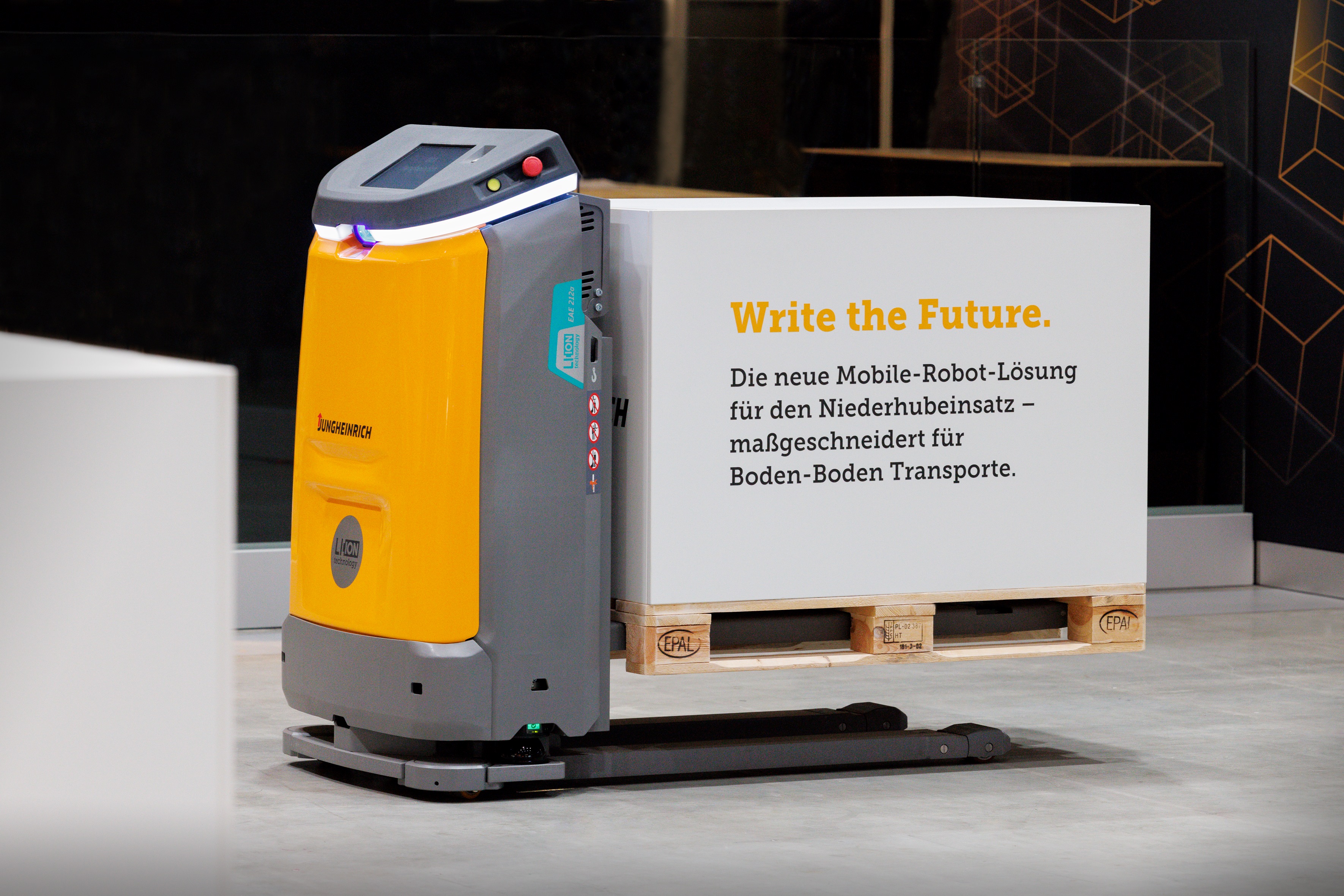 De EAE 212a is ontworpen voor de automatisering van laagheffend transport. Dankzij het door Jungheinrich gepatenteerde chassisontwerp is hij met slechts 790 mm smaller dan een europallet. Dit maakt hem bijzonder wendbaar en transport van floor-to-floor mogelijk bij snelheden tot 6 km/h. Tegelijkertijd kan de truck ladingen tot 1,2 ton vervoeren. "Als laagheffende truck vult de EAE 212a ons bestaande mobiele robotportfolio optimaal aan en is perfect geschikt voor de aan- en afvoer van inkomende en uitgaande goederenbanen", aldus Erlach. Voor de navigatie van de EAE 212a zijn geen kunstmatige oriëntatiepunten nodig. Tijdrovende voorbereidende maatregelen in het magazijn behoren daarmee tot het verleden.